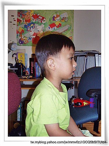 理髮中...(New寶爸一面閉目養神,一面聽CD)。