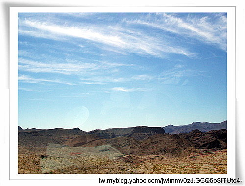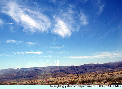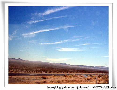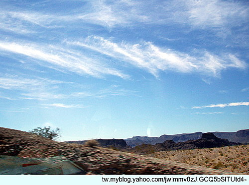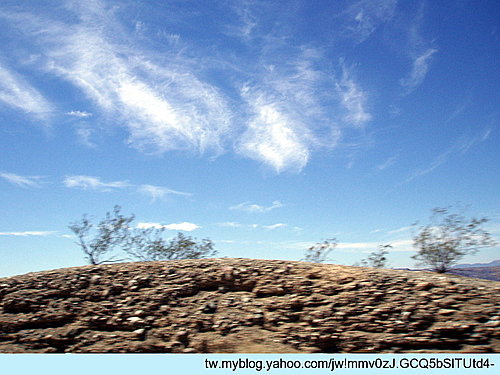 美國真得很大,我們開了好久,眼見的一直是偶爾出現的仙人掌、約書亞樹和野草點綴著光禿禿的山巒和一望無際的沙漠,令人昏昏欲睡。筆直的道路,上上下下的坡段,再加上時速有時近90英哩 (144公里),彷彿在開虛擬實境裡的賽車。但是,當New寶媽一瞥見偶爾出現、插在路旁的小型白色十字架 (不知是不是發生過死忙車禍?),就猛然一驚,提醒自己絕不可以睡著,也向主耶穌禱告,要平安地完成旅途。公路邊緣的路面有一條特殊帶狀壓紋,若車子稍微偏離車道,車輪與壓紋摩擦的"咚咚"聲就會嚇醒駕駛人。