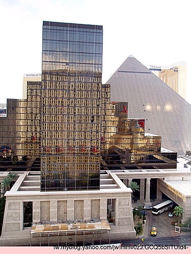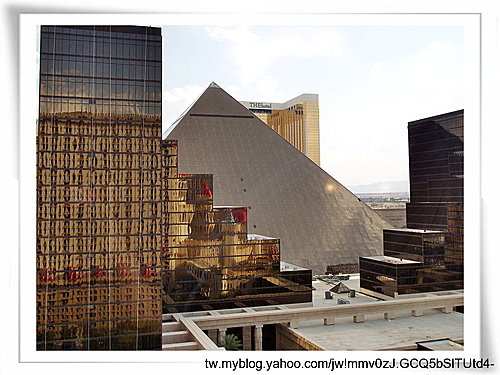 金字塔飯店(Luxor)。鑲滿鏡子的飯店外牆,倒映出神劍飯店的影像。