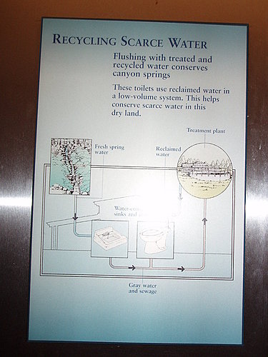 在廁所門後的稀有水資源再利用 (Recycling scarce water) 的解說圖