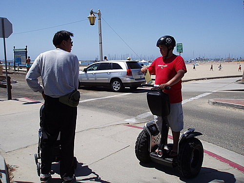 紅衣服的青少年站著騎的是一種新近發明的高科技兩輪電動車(Segway,塞格威或滑車),一小時租金約40多美元。