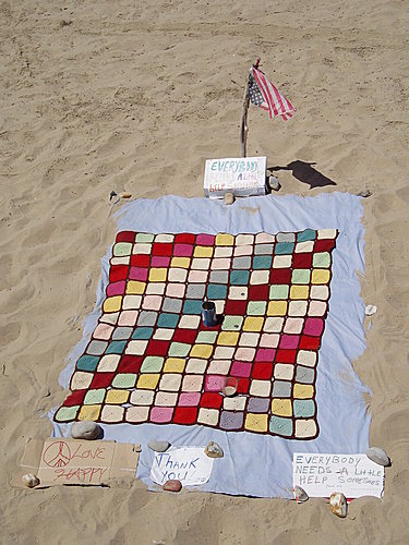 木橋邊的沙灘上,不見人影的懶惰乞丐鋪了一塊布,再放上一個鐵罐要錢。沙灘低於木橋兩三公尺,要給錢就從橋上往下丟。橋邊不只有這一塊布,附近不遠還有另一塊用來行乞的布。