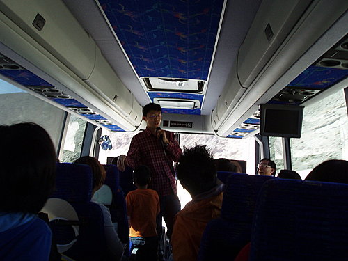 在遊覽車上,UCI 的Fa Fa叔叔講話。