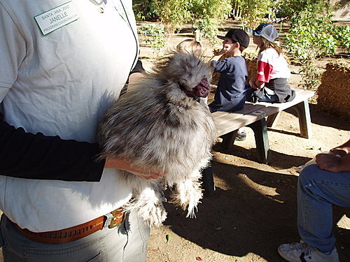 保育員抱著北京怪雞讓小朋友觸摸。