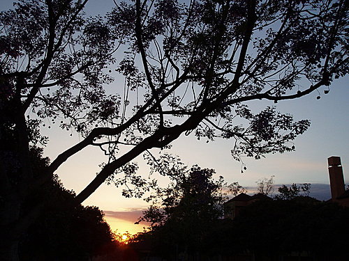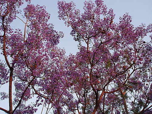 夕陽餘暉中開滿紫花的樹。