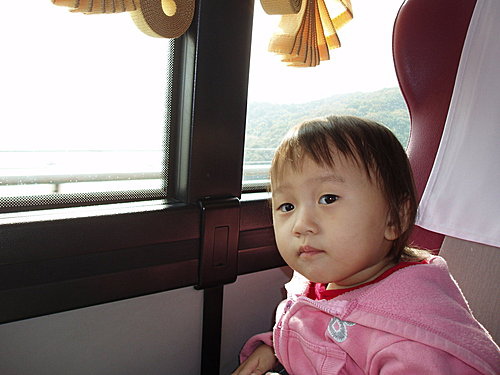 到了那裡,再問一次服務檯小姐。服務檯小姐有會說英文和中文的,所以我們很順利的買到車票,坐對公車。看,J寶覺得很有趣。