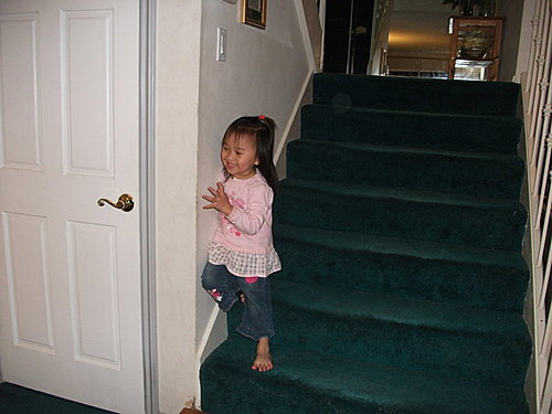 J寶在Monica阿姨家毛茸茸的樓梯上,好開心。