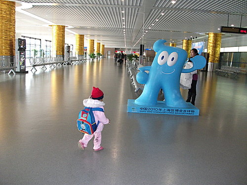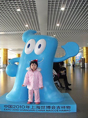 J寶看到上海世博吉祥物海寶,就開心地跑過去。