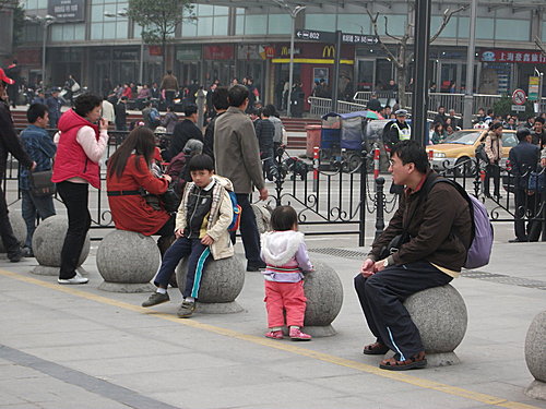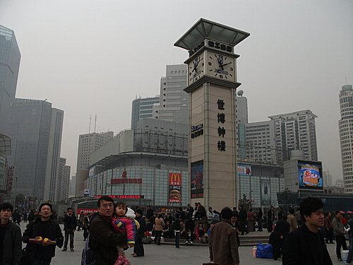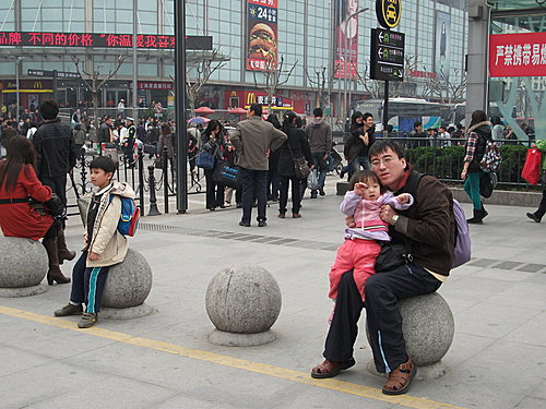 熙來攘往的人群中,可看到把所有家當包成一個大布包的民工茫然無助的坐在廣場中等待工作機會。