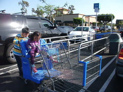 J寶很堅持要坐這種可坐三個小孩的大賣場推車。