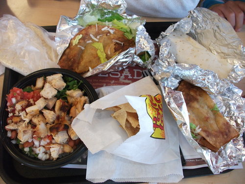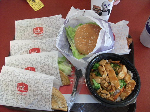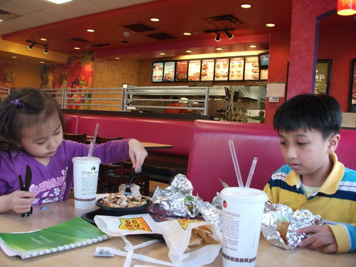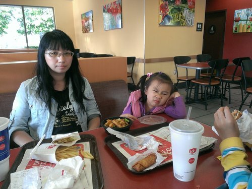 晚餐時間在墨西哥速食連鎖餐廳"Jack in the Box",J寶作怪表情。